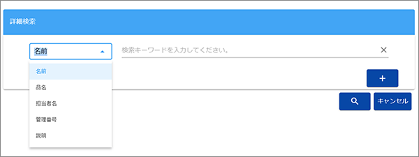 検索対象となるパラメータを選択し、検索対象に対して検索したい文字列を入力してください。検索条件は「+」をクリックすると追加できます。「検索」アイコンをクリックすると詳細検索ができます。