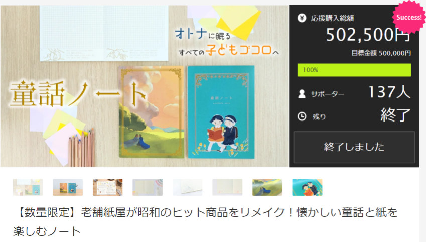 グループ 2022年12月26日懐かしい童話と紙を楽しむ「童話ノート」プロジェクトが、目標金額50万円を達成して終了しました。多くの皆様から応援いただき、誠にありがとうございました。